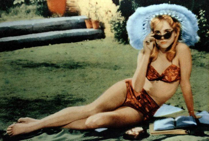 Sass, camera, action! Sitting with her legs crossed in a brown two-piece bikini, sunglasses, and an iconic light blue wide-brimmed sunhat, Sue Lyon exudes sass in the 1962 movie “Lolita.” Her playful glance at the camera adds to her undebatable appeal in this scene. Surprisingly, Sue was only 14 when she was cast as Lolita, a role that demanded a complex and mature performance.