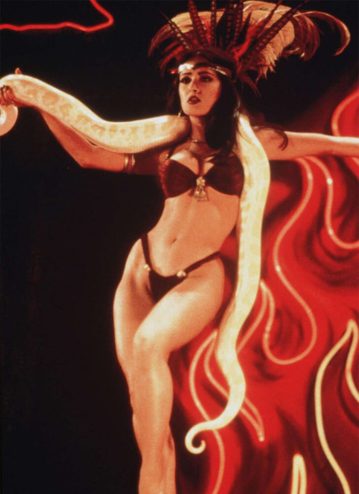 In the 1996 film “From Dusk Till Dawn,” Salma Hayek delights in a sensual two-piece black bikini that flaunts her curvaceous body. It is accessorized with a feathered headdress and a large yellow snake draped across her shoulders. Her role as Santanico Pandemonium, a seductive vampire queen, is iconic in this cult classic directed by Robert Rodriguez.