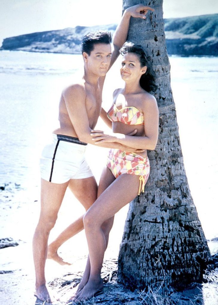 Decked out in a colorful, patterned two-piece swimsuit, Joan Blackman leans against a palm tree in the 1961 film “Blue Hawaii” alongside Elvis Presley, who dons white trunks. This role boosted her visibility in Hollywood, leading to more opportunities in film and television. Joan’s striking physical appearance caught attention with her glowing smile.