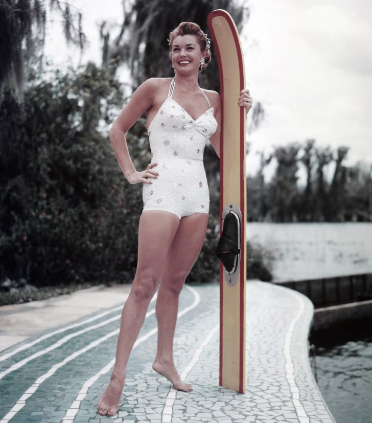 Talented star performer Esther Williams smiles gleefully in a retro one-piece white swimsuit on the set of 1953’s “Easy to Love.” This role utilized her athletic prowess and confirmed her status as Hollywood’s favorite swimming star. Her glorious beauty and grace in this feature remain remarkable. Popularly dubbed “America’s Mermaid,” her career flourished with a series of aquatic-themed musicals.